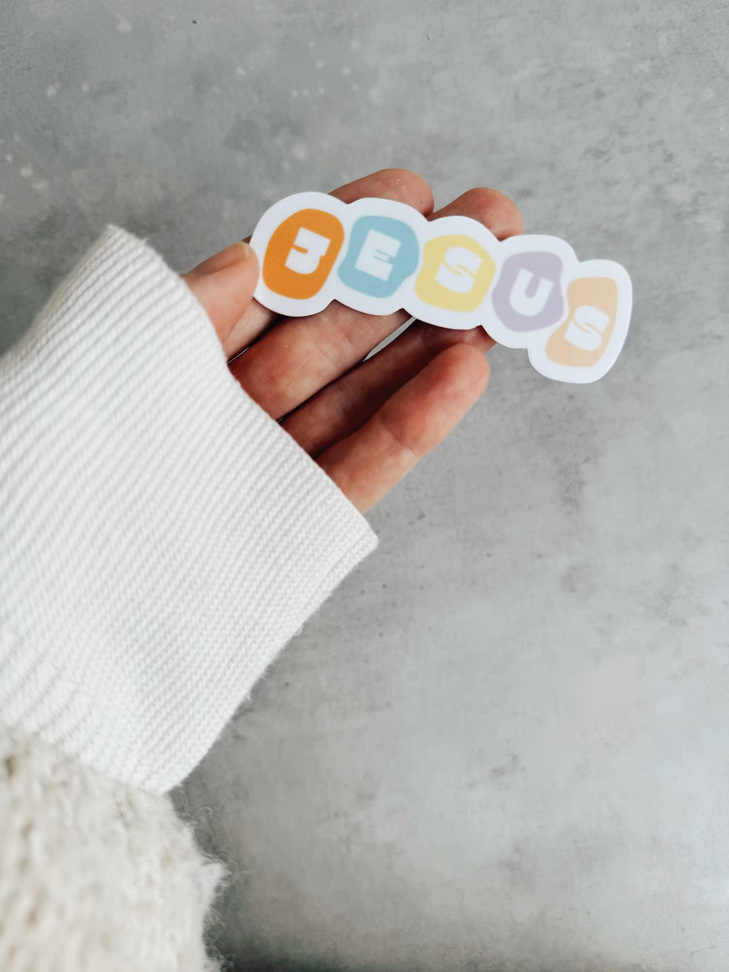 "Jesus" - Ett klistermärke med en enkel påminnelse om att Jesus alltid är närvarande och vakar över oss. Sätt klistermärket där det kan behövas; på Bibeln,