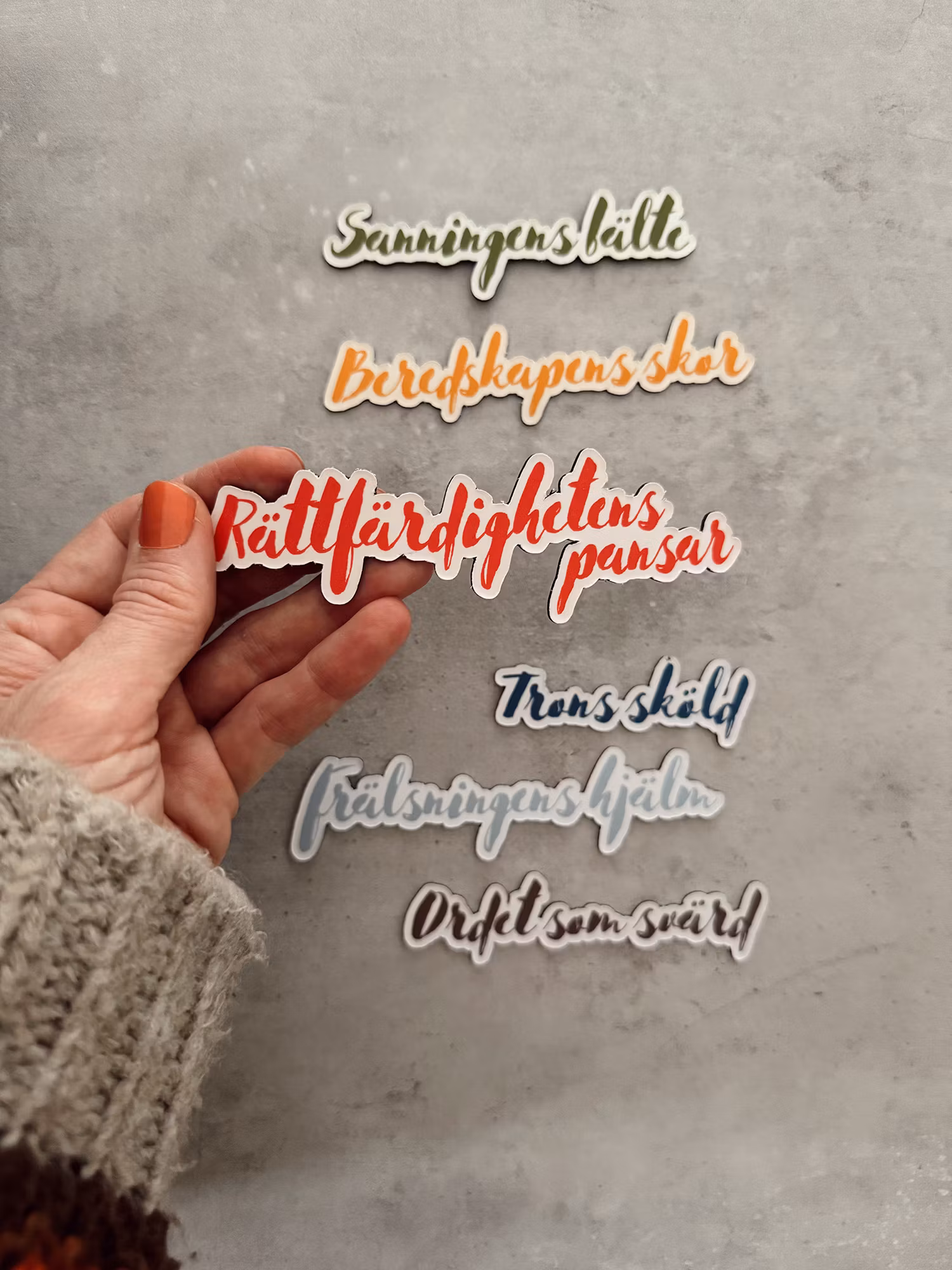 Sex stycken kylskåpsmagneter som representerar alla delar av Guds fulla rustning som vi iklär oss för att få beskydd mot djävulens listiga angrepp.Sanningens bä