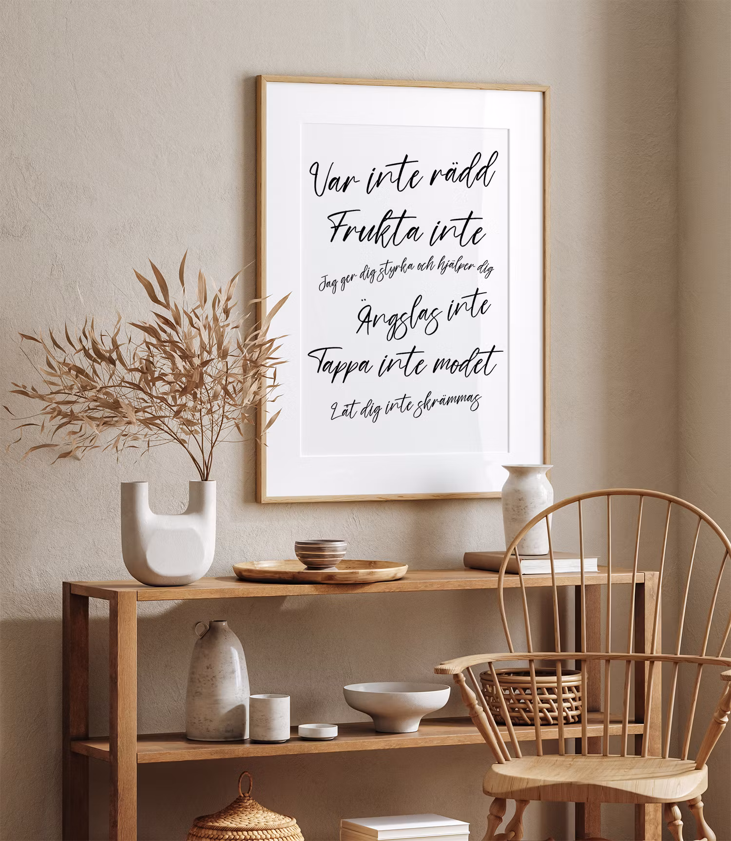 Eftersom ramen inte ingår i köpet behöver du köpa till en ram. Storlekarna är alla standard som går enkelt att hitta där ramar säljs. Den här printen gör sig riktigt fin i en mörkare träram (tänk ek eller valnöt) eller svart ram.